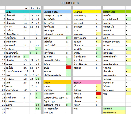 เริ่มด้วยการเช็กอากาศและลิสท์ของใช้ทั่วไปก่อนให้เรียบร้อย แล้วก็ขนๆๆ สิ่งที่ต้องการมากองไว้รวมกันแล้วค่อยแยกเก็บเป็นส่วนๆ ถ้าไม่ค่อยมีเวลา ควรเริ่มเก็บของมากองไว้ใกล้ๆ กระเป๋าก่อนการเดินทางซัก 3-4 วัน ทีละนิดละหน่อย นึกอะไรออกก็จดไว้ ขาดอะไรจะได้รู้...ค่อยๆ กลับมาติ๊กๆ เพิ่มในลิสท์